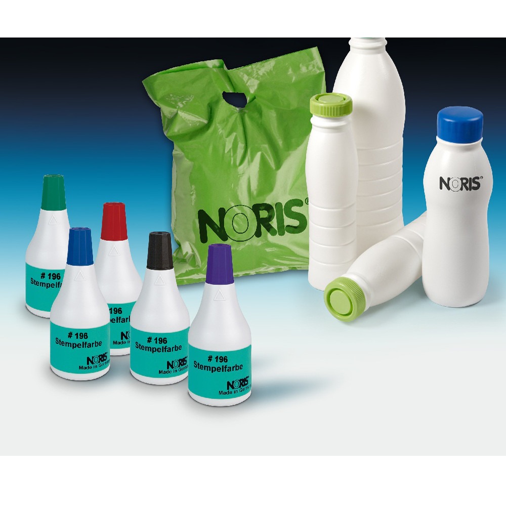 De Noris stempelinkt 196 voor MC (glad papier), folders, plastic draagtassen en autobanden. Verkrijgbaar in de kleuren: Zwart, Blauw, Rood en Groen. Noris 196 is op alcoholbasis en waterbestendig. Deze Noris stempelinkt 196 moet op een industrieel kussen toegepast worden. Folders op glad papier: droogtijd circa 11 sec. Plastic draagtassen: droogtijd circa 11 sec. Kunststof PA/PVS/PS/SAN: droogtijd circa 12 sec. Autobanden/rubber: droogtijd circa 12 sec.